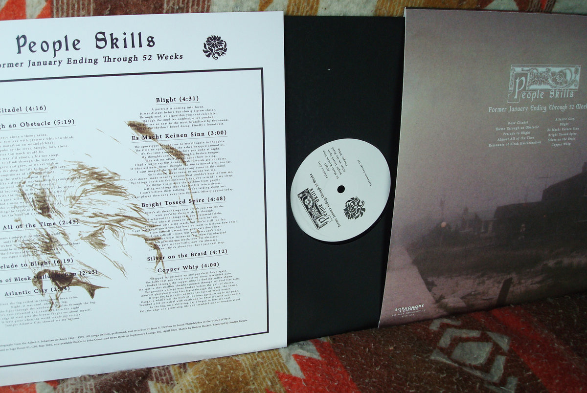 The inner logic here in People Skills, beyond a cloud of ambiguity, is a remarkable balance between the shattered plaster electronics and Jesse’s melodious chording. The blunted ass casio beats and the haunted lonerman vox riding tremble alongside make it perfect. The encased-in dust-for-a-few-winters production value is just gravy. We got a glut of lonerism on tape we do... but none of it is really so expertly and woozily executed as it is here on People Skills, Former January Ending Through 52 Weeks. So thanks to Jesse for the sore-audio vision and thanks to Ryan at Sophomore Lounge for putting it out, with care, on wax.”