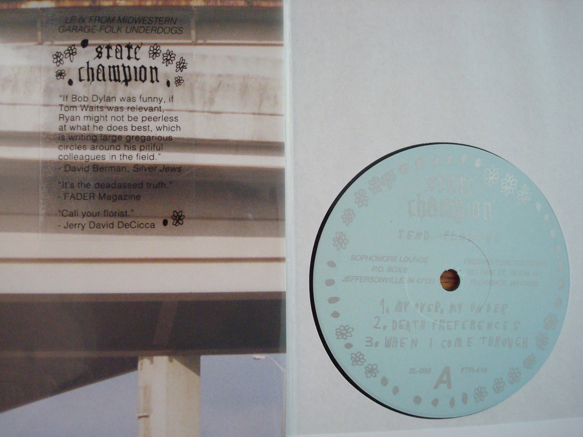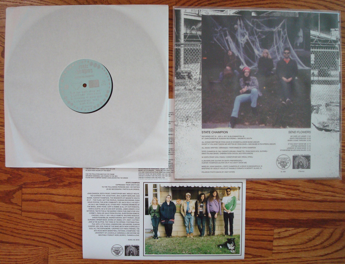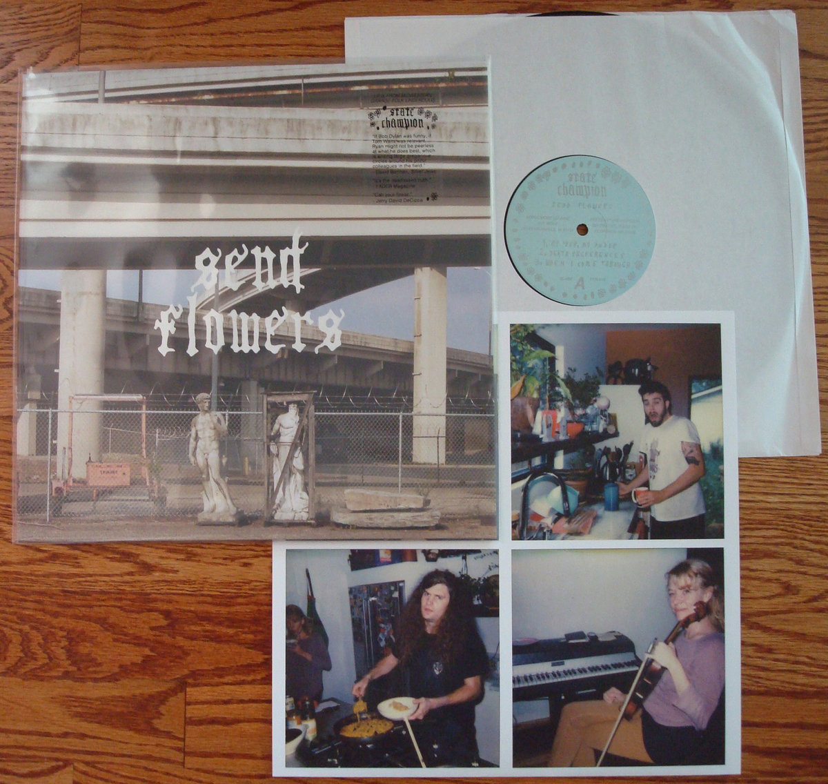 Full-length vinyl version of State Champion's "Send Flowers" LP. First pressing of 1000 copies on black vinyl w/ color insert + tip-on jackets. Co-released on Feeding Tube Records.