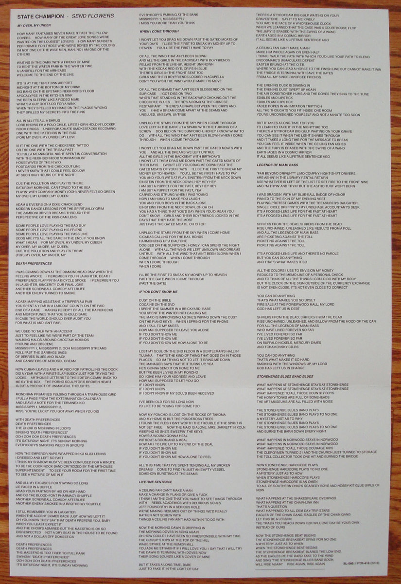 "'Send Flowers' is State Champion’s most fully realized Beard Rock expression to date. The surrealist underpinning of Ryan’s lyrics are heavier than ever, but that is balanced by the band’s most epiphanically tasty licking. The pieces fit together with such easy organic grace, it’s tempting to suspect they’re simple. But the closer you listen to the parts the more complex they appear.
